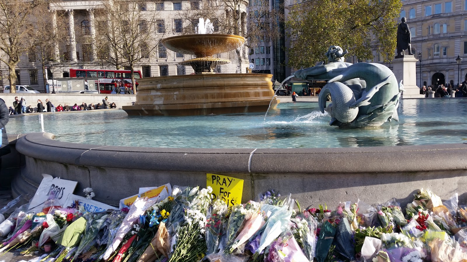 :) Na placu kwiaty i znicze upamiętniające niedawne zamachy terrorystyczne w Paryżu. Co ciekawe należy dodać, że w Londynie pomimo wydarzeń paryskich nie widać wzmożonych kontroli, zupełny brak paniki i popadania w paranoję. Policji bardzo mało.